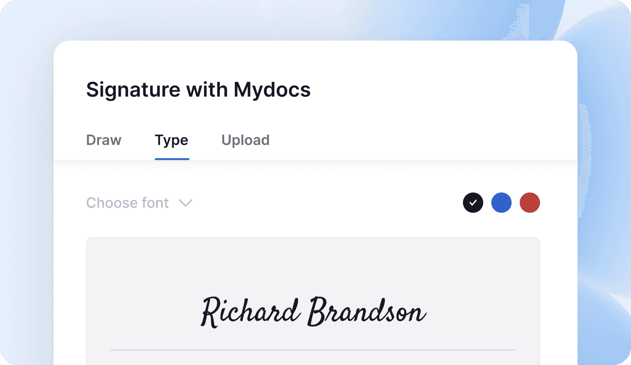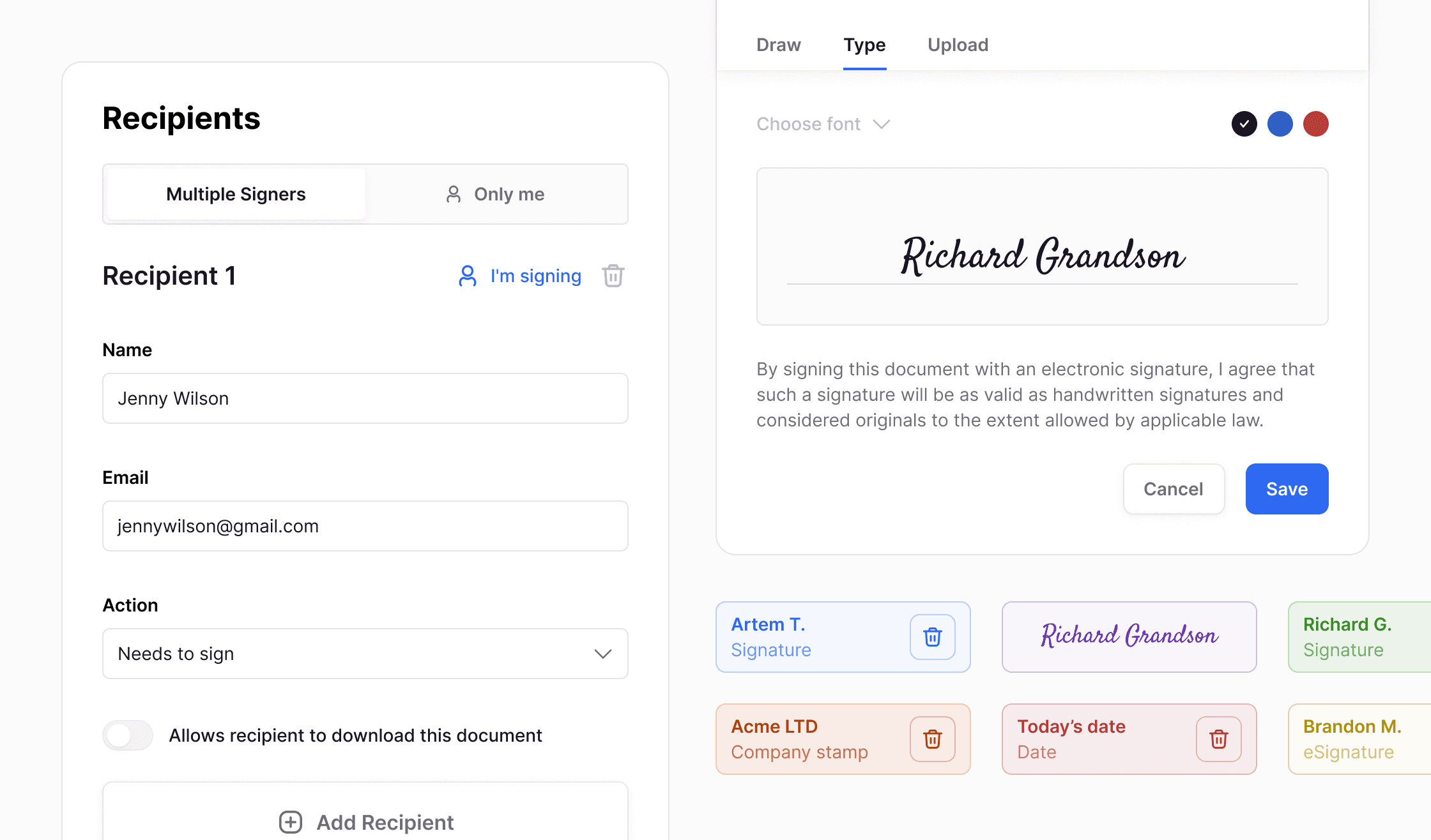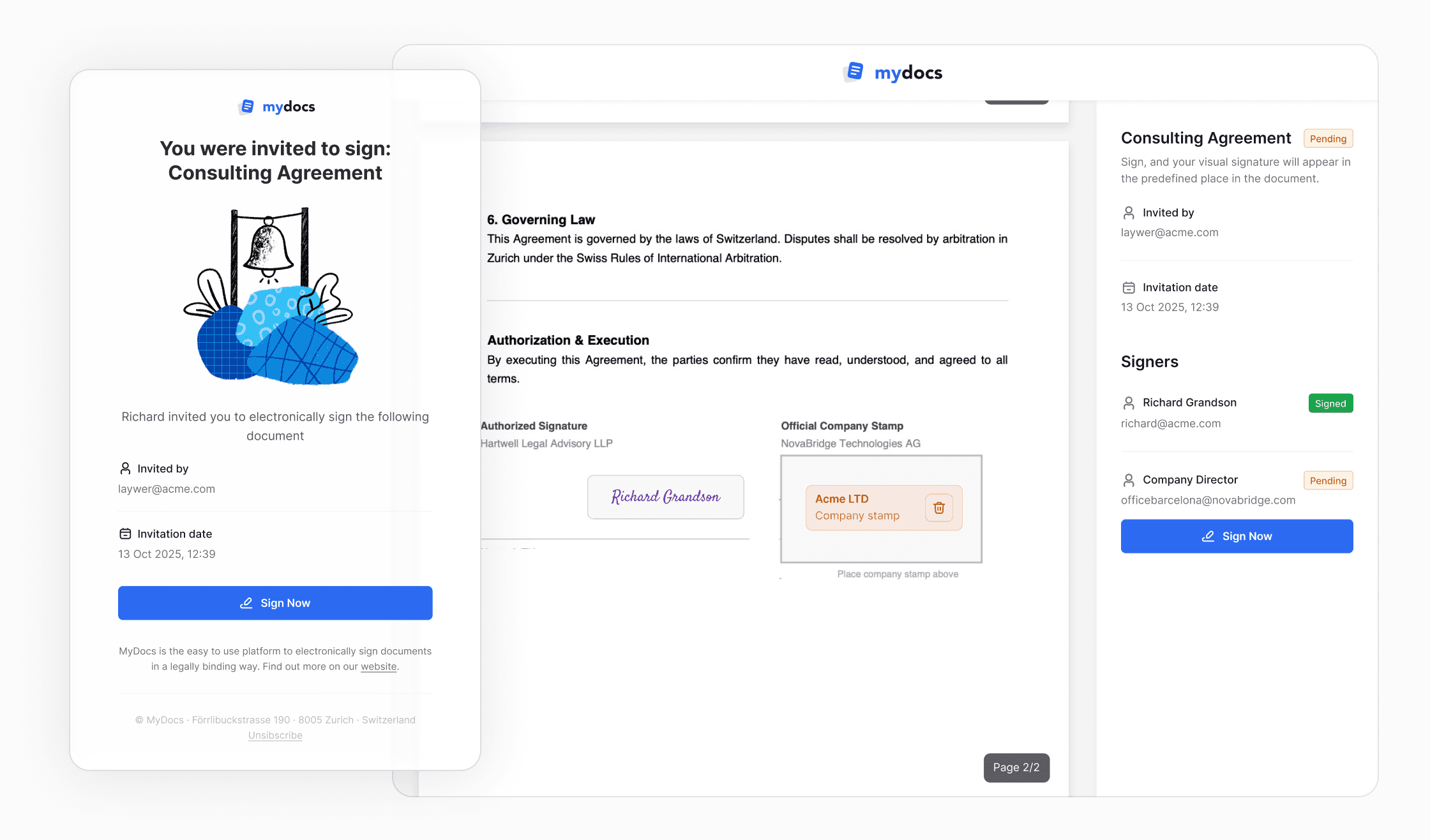 The sender creates a document and assigns recipients. Each signer receives an email with a magic link to review and sign without registration. Color-coded placeholders make it immediately clear what type of input each party needs to provide: signature, company stamp, or date. The flow tested as straightforward with a high success rate.