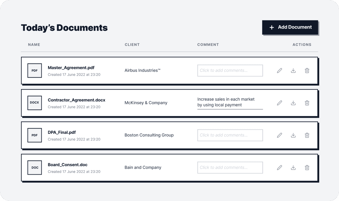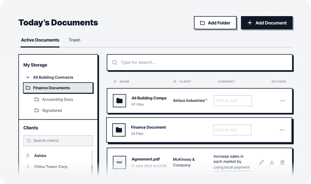 The dashboard gives senders a full picture at a glance: active documents, client associations, and quick actions in one view. Folder-based navigation and client search sit in a persistent left panel, keeping the workspace organized as document volume grows.