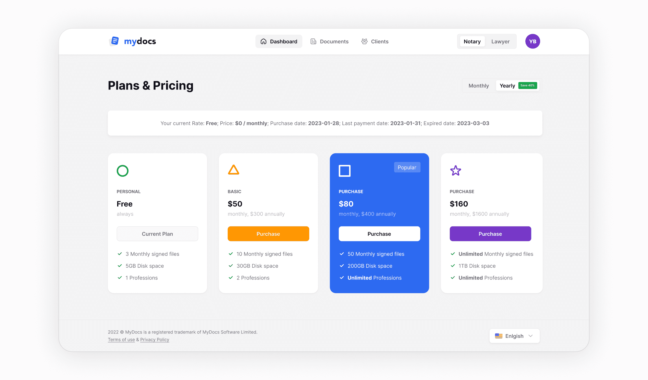 Full product designed and planned from zero: Sender dashboard, document management with folder structure, recipient configuration, signature placement interface, signer flow, signature creation modal (draw / type / upload), real-time signing status, landing and pricing pages, perfect cards to promote features, and a complete set of transactional emails covering every state in the signing lifecycle.